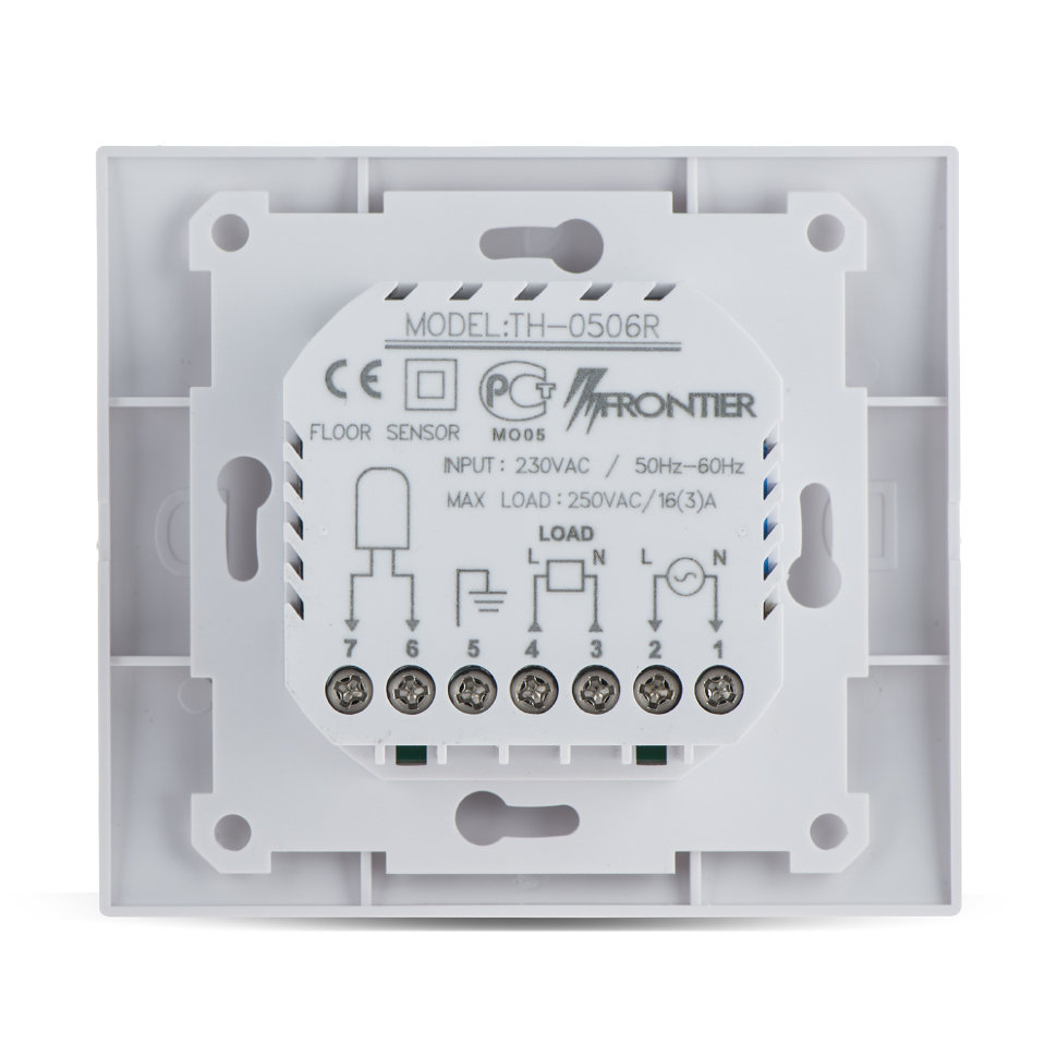 Универсальность модели терморегулятора Frontier TH 0506R заключается в том, что он благодаря входящим в комплект поставки специальным переходным кольцам может быть установлен в единые рамки различных производителей электроустановочных изделий: