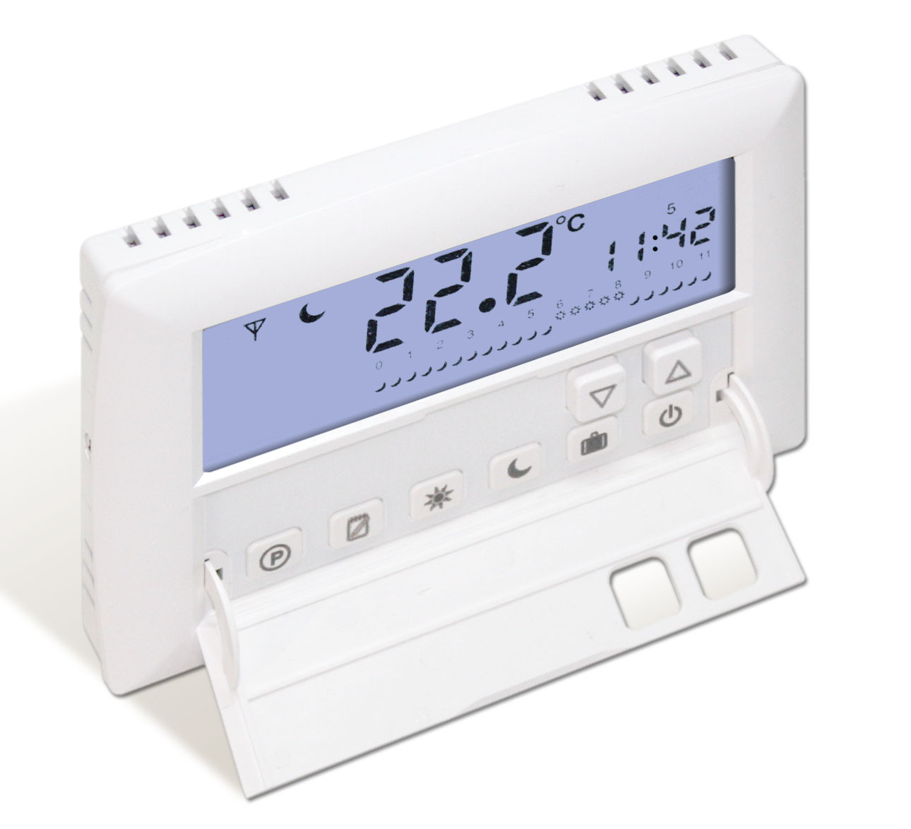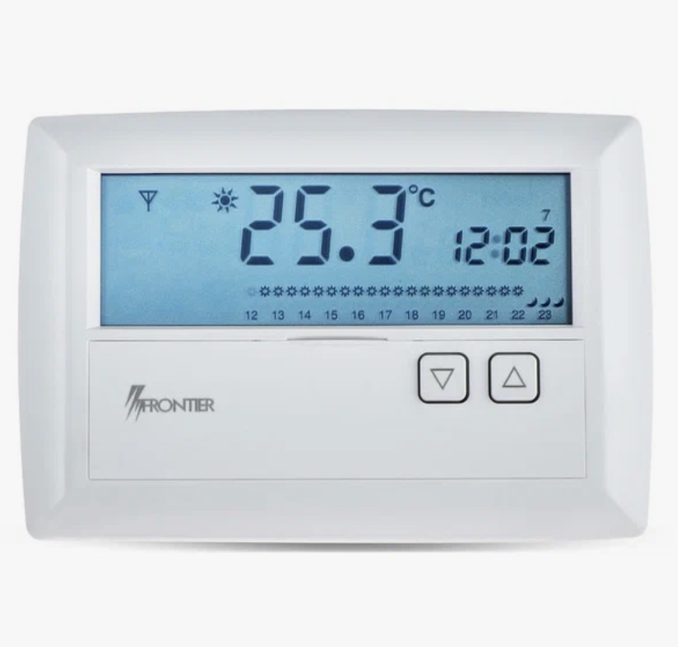 Беспроводной программируемый электронный терморегулятор Frontier TH 1310P-RFR устанавливается в помещении с одним или несколькими радиаторам отопления(батареями). Пользователь может запрограммировать на терморегуляторе желаемую температуру помещения в зависимости от времени суток и дня недели.